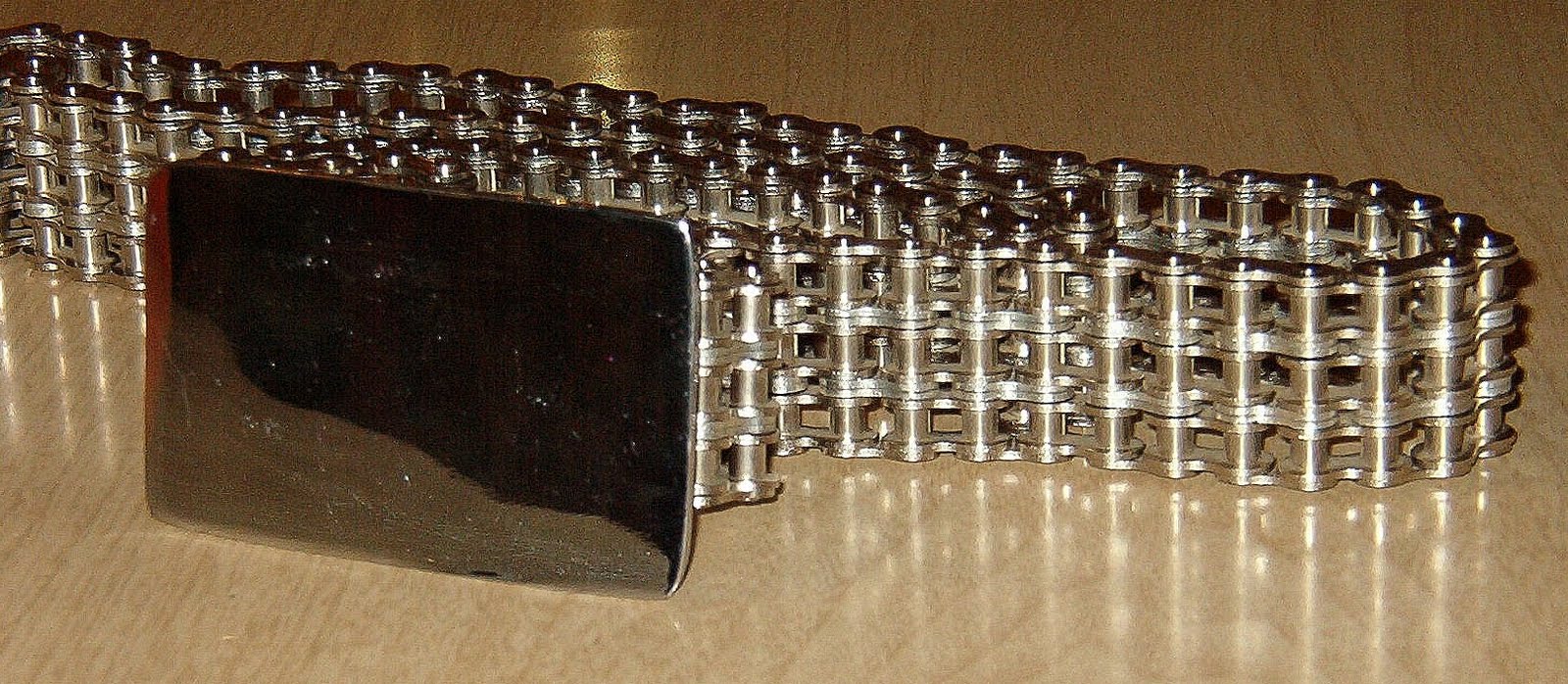 There was a company called M&M Limited years ago that sold them out of Chicago. They called them Eazy Rider Motorcycle Chain Belts. Here is their ad with the different styles. I have one of each of these belts in my collection except the Gladiator. I have only seen one of those on eBay and it sold for big bucks.